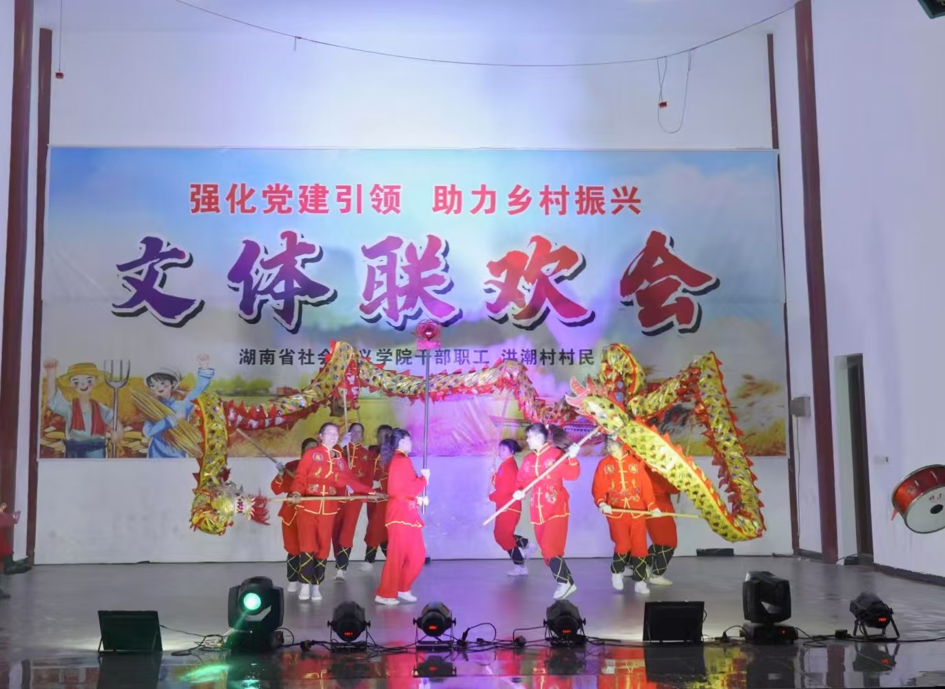 晚上7点,学院教职工与洪潮村村民在乡村文化广场上举行“文体联欢会”,共同走上舞台,诗朗诵、大合唱、舞龙、太极拳、广场舞等各种节目精彩纷呈,令人回味无穷,活力舞台绽放欢声笑语。大家纷纷表示,这场联欢会不仅丰富了精神文化生活,还增强了凝聚力和向心力,大家将更加凝心聚力,着力发挥党建引领作用,助力乡村振兴再奋进。